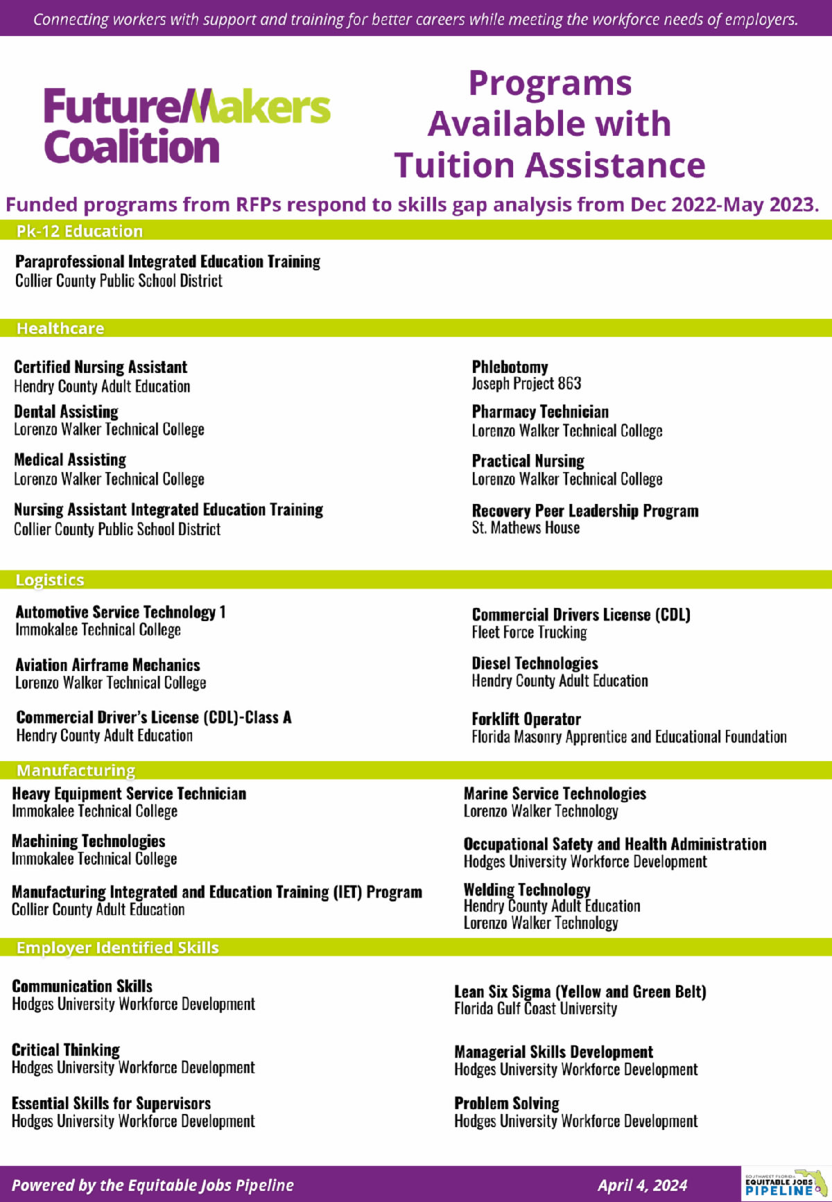 The Southwest Florida Equitable Jobs Pipeline is actively seeking employer partners in Southwest Florida who are enthusiastic about sustaining workforce development initiatives in four key sectors for both new and existing employees: PK-12 Education, Manufacturing, Logistics, and Healthcare through participation in the Equitable Jobs Pipeline. Ideally, proposals will include a well-defined strategy for the employer to gradually assume the cost of training, with the goal of achieving sustainability by December 2025.