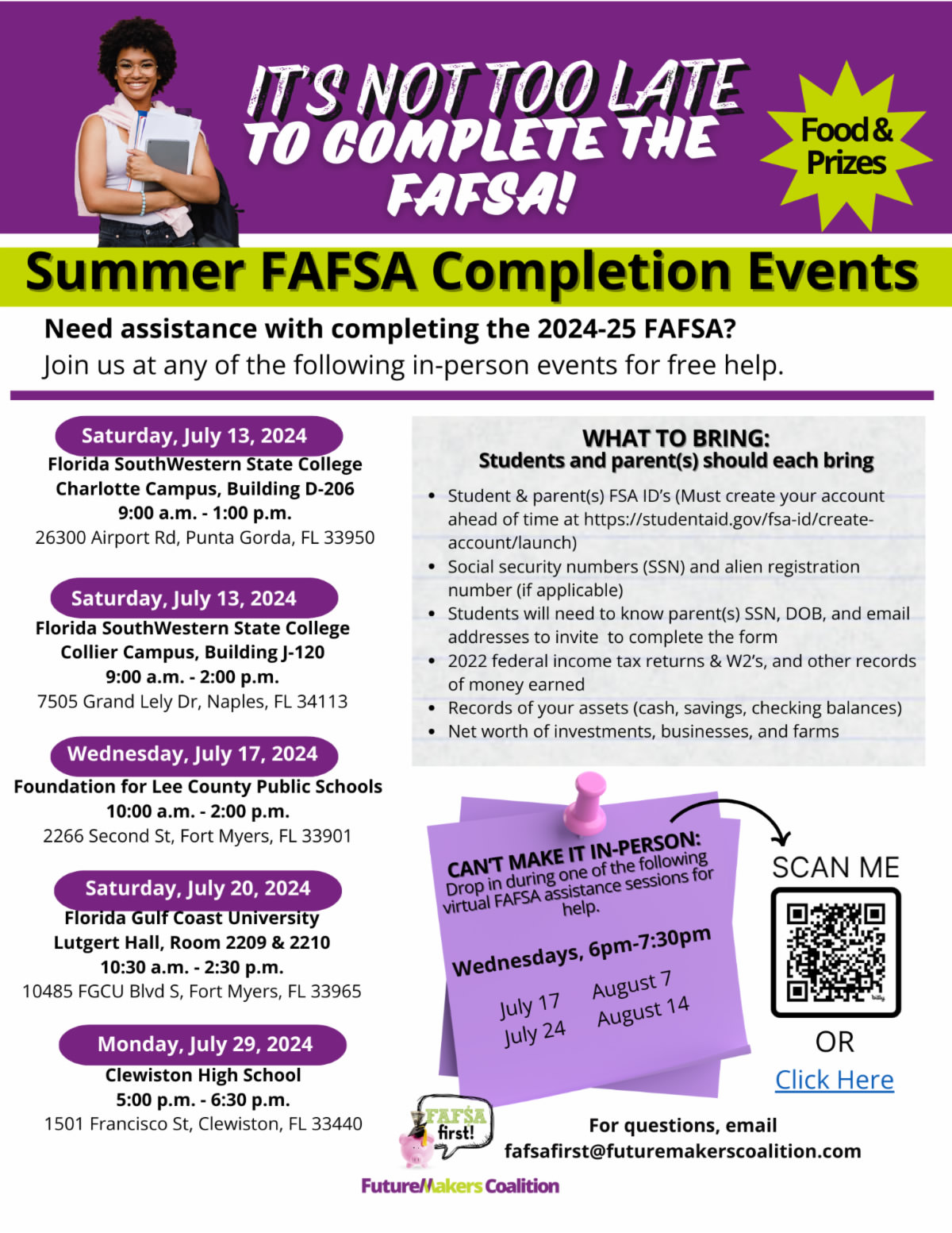 It’s not too late to complete the FAFSA! As many are aware, the 2024-25 FAFSA application cycle has brought substantial changes to the student financial aid application process. The application form is different, new eligibility criteria, terminology, and requirements for contributors as well as a shorter timeline to complete the application. Opportunities are available this summer to help students still needing to complete the 2024-2025 FAFSA form so they can get the money they need for college. Many of SWFL’s community partners have rallied to help and are offering in-person and virtual FAFSA assistance.