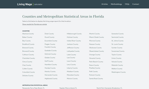 Counties and Metropolitan Statistical Areas in Florida. Display the living wage report for areas of Florida.